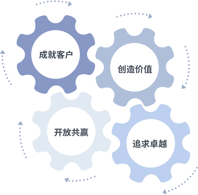 成就客户是一切决策的出发点,,,创造价值是衡量所有工作的标准,,,追求卓越是我们做事做人的态度,,,,开放共赢是我们的格局也是最终的结果。。。。价值观的齿轮环环相扣,,推动着组织里的每个人不断向前。。。