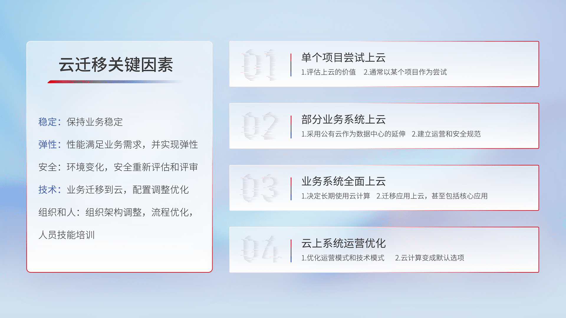结合实际业务,,,,从规划设计、、、云平台选型、、云原生改造、、、、数据迁移、、、、集成交付,,迁移全过程为客户识别最佳上云路径,,做好风险识别管理,,设计网络架构、、、、身份权限、、安全审计合规、、、操作审计、、日志审计、、监控告警策略、、、、多站点容灾设计等,,对云上基础设施进行整体规划,,,提升IT治理水平,,以满足弹性、、、高可用、、高性能的需求。。。