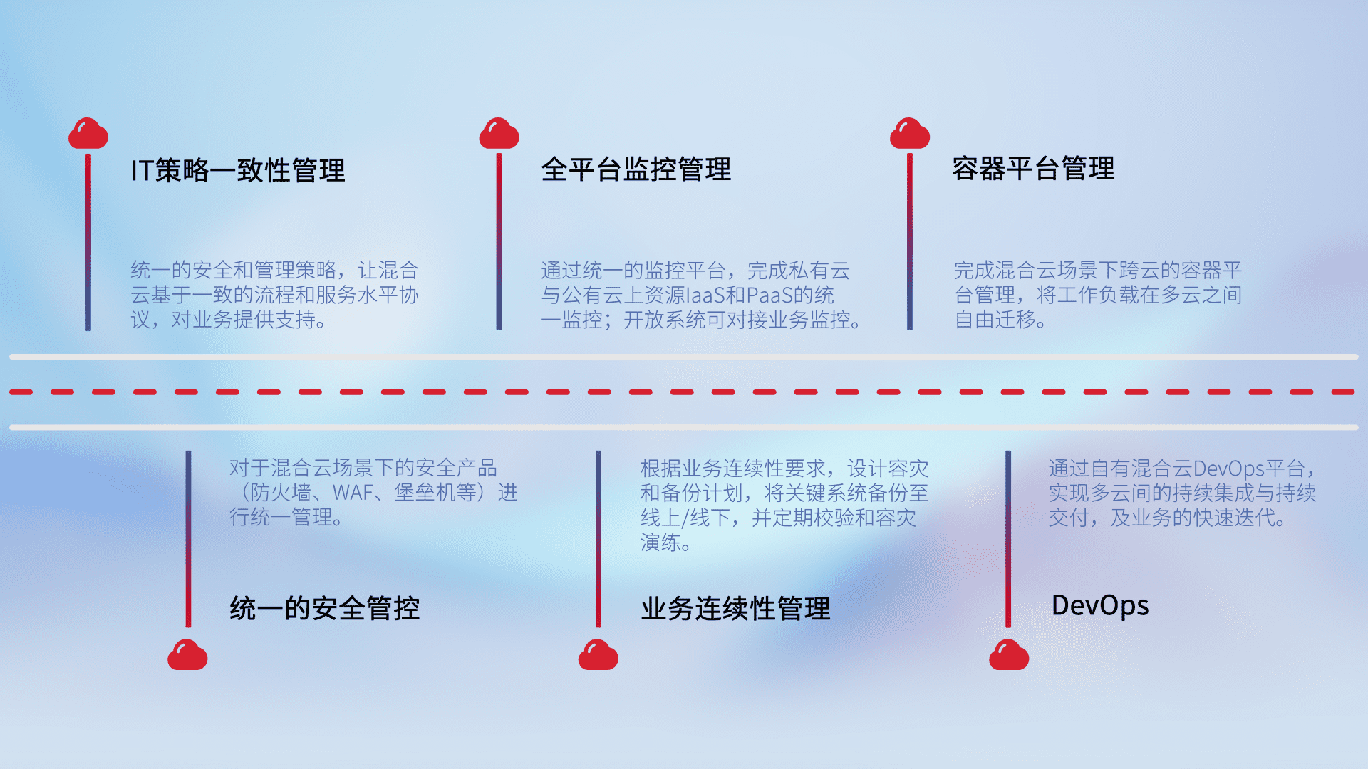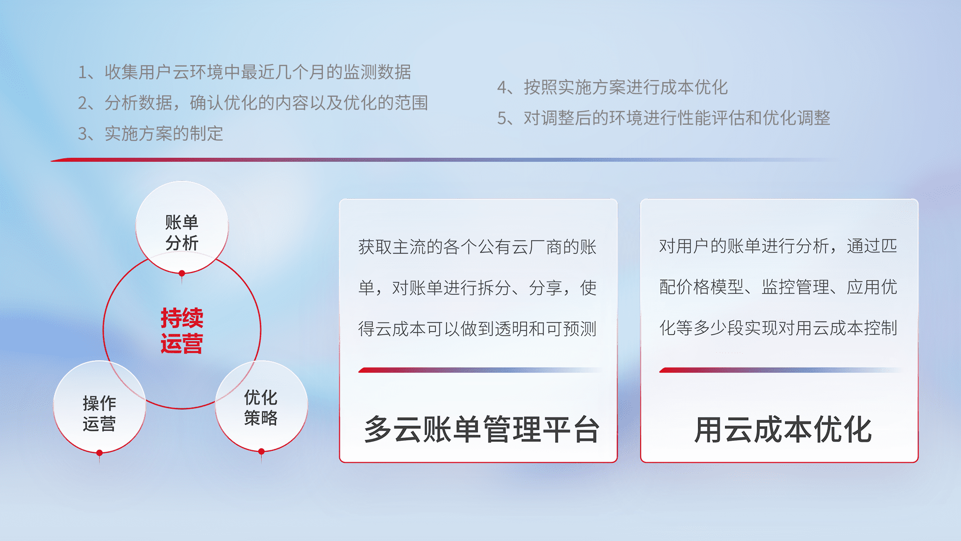 通过多云纳管,,,以统一的资源数据模型把客户的云资源进行抽象和封装,,,进而实现对多云资源的统一操作,,,,保障云资源管理的可靠性、、、、稳定性与可用性。。。量身定制化运维内容,,,,配置、、开发运维、、、、补丁管理、、、、备份、、监控、、、认证和访问管理、、审计和日常巡检等,,,保障在用云过程中的可靠度,,,,稳定度以及高可用率。。